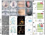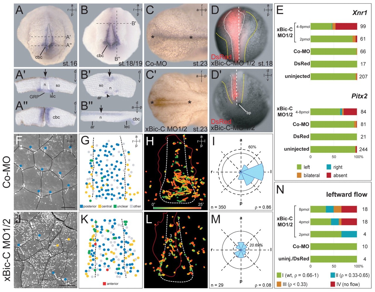 Fig. 3. Knockdown of xBicC alters laterality, cilia polarization and leftward flow in Xenopus laevis. (A-Bâ²) Expression of xBicC in the gastrocoel roof plate (GRP; outlined by dotted lines in A and B), floor plate (arrow in Aâ²,Bâ²,Bâ²) and epithelial lining of the circumblastoporal collar (cbc) at flow stages 16 (A) and 18/19 (B), as shown by whole-mount in situ hybridization analysis of dorsal explants (ventral views). Levels of sections in Aâ², Aâ², Bâ², Bâ² are indicated by dashed lines. ar, archenteron roof; n, notochord; so, somite; black arrowhead, xBicC-positive somitic cells. (C,Câ²) Neural tube closure defects in embryos injected with xBicC MO1/2 (Câ²) compared with Co-MO-injected specimen (C). Asterisks indicate closed (C) and open (Câ²) neural tubes. (D,Dâ²) Delayed closure of the neural tube in a unilaterally injected embryo with xBicC MO1/2 and lineage tracer DsRed. Dorsal (D) and posterior (Dâ²) view of superimposed fluorescence and bright-field images (midline indicated by dashed line, neural fold by yellow dotted line, floor plate by white dotted line). bp, blastopore. (E) Summary of marker gene expression patterns (Xnr1, top; Pitx2, bottom). Numbers indicate number of treated embryos. (F,J) Scanning electron microscopy analysis of GRP cells at stage 18 in Co-MO (F) and xBicC MO1/2 (J) injected embryos revealed predominantly posteriorly polarized cilia in control (F) and intermingled cilia orientation in xBicC morphant specimens. Scale bar: 10 μm. (G,K) Markedly reduced proportion of polarized cilia in xBicC MO1/2 (K) compared with Co-MO (G) injected embryos. The border of the GRP area relevant for flow is indicated by dashed lines. (H,I,L,M) Flow analysis in Co-MO (H,I) and xBicC MO1/2 (L,M) injected embryos. (H,L) Trajectories of beads displayed as GTTs of 25 second length (cf. color gradient bar in H). Red lines mark approximate limits of targeted areas, as visualized by co-injected DsRed; white dashed lines indicate border of the GRP. Note the presence of left (1), right (2) and circling (3) GTTs in L. (I,M) Frequency distributions of trajectory directionalities at the GRP of Co-MO (I) and xBicC MO1/2 (M) injected specimens. Solid circles represent the 50% boundary, dashed circles mark maximum frequency in histogram specified in percent. n, number of particles above threshold; Ï, quality of flow. Note the leftward direction of 60% of trajectories in (I) compared with the about equal distribution of trajectories in M, and the overall much reduced number of particles above the threshold of 2.5 μm/second in M. (N) Summary of flow analysis from 54 explants. Classification of embryos with flow into categories I-IV based onÏ . Numbers indicate the number of analyzed explants.