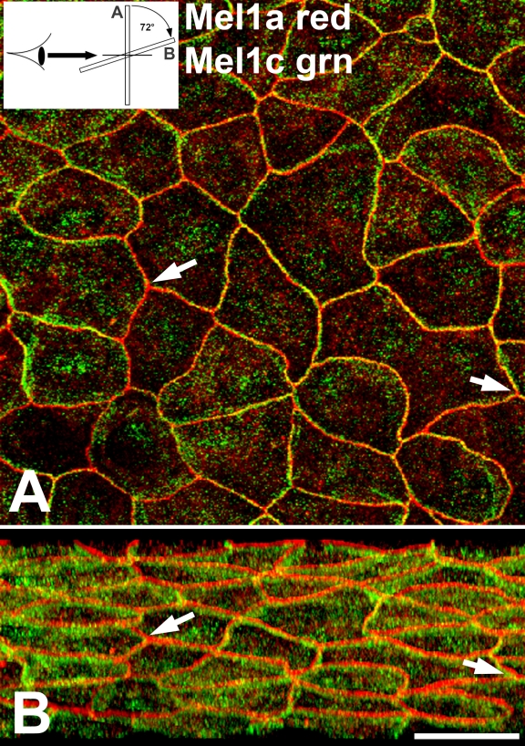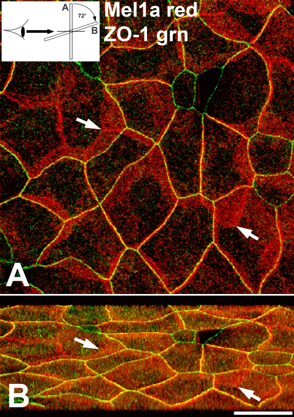 Figure 7. Confocal double-label immunocytochemical localization of Mel1a and ZO-1 in Xenopus corneal whole mounts. A: Mel1a and ZO-1 immunolabeling is observed on the lateral plasma membrane, with some immunoreactivity also occurring in the cytoplasm. Mel1a (red) labeling is present predominantly as very broad bands on the lateral membranes, including the obliquely-oriented lateral membranes (arrows). The plasma membrane has an abundance of yellow labeling, indicative of a very close proximity of red Mel1a and green ZO-1. The ZO-1 labeling was not as broadly distributed on the lateral membrane. The inset illustrates the 72° rotation on the x-axis of the image in A, indicating the orientation relative to the viewer’s eye in B. B: Three-dimensional reconstructions of confocal z-stacks of optical slices were rotated at 72° degrees on the x-axis to enable optimal viewing of the pattern of immunolabeling. Arrows are provided as reference points to indicate the same points on panel A. The rotated image shows that the green ZO-1 labeling is generally located apically to the red Mel1a labeling. The ZO-1 labeling appears as a relatively narrow continuous band of green labeling on the lateral plasma membrane, whereas a much broader band of red Mel1a labeling appears directly basal to the ZO-1 label. Significant yellow labeling is observed, indicating that the Mel1a receptor is in very close proximity to ZO-1. The confocal images in both panels are comprised of seven optical slices of 400 nm each in the z-series. The magnification bar (B) represents 20 µm.