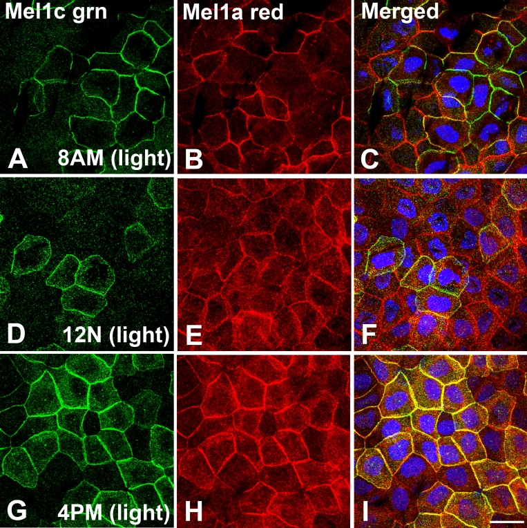 Figure 9. Mel1a and Mel1c immunocytochemistry of whole-mounted Xenopus laevis surface corneal epithelium obtained at 4-h intervals during a 24-h lightâdark cycle. Frogs were housed under a 12 h:12 h lightâdark cycle (6:00 AM: lights on; 6:00 PM: lights off). All tissues in this figure were obtained in the light. Mel1c labeling is represented in green (A, D, and G) and Mel1a labeling is represented in red (B, E, and H). The yellow labeling in the merged images (C, F, and I) indicates regions of co-localization of the red and green signal. A-C: Corneas obtained at 8:00 AM (2 h after lights on). Mel1c and Mel1a labeling is localized to the lateralplasma membrane of different yet overlapping subpopulations of cells. D-F: Corneas obtained at 12:00 N (mid-light). Mel1a and Mel1c immunolabeling is present on the lateral membranes of different populations of CE cells, with some minor regions of overlap. G-I: Corneas obtained at 4:00 PM (2 h before lights off). Most of the Mel1a and Mel1c immunolabeling is co-localized on the lateral membranes, with some cytoplasmic labeling that is not co-localized. Nuclei are stained with DAPI. The confocal images in all panels are comprised of three optical slices of 400 nm each in the z-series. The magnification bar (I) represents 20 µm.