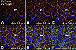 Figure 6. Localization of Mel1a and Mel1b in progressive confocal optical slices of Xenopus corneal epithelium. A: Image of the most superficial surface of the surface corneal epithelium. Note the predominance of yellow (merged red and green) labeling of most lateral membranes, with a lesser amount of interdigitated red Mel1a labeling (note arrowheads indicating an example of this). B-F: As the 0.4-µm slices progress deeper into the corneal epithelium layer , there is not a transition from red to green labeling as was seen with Mel1a-Mel1c, but instead the predominance of yellow labeling with some interspersed red labeling is maintained throughout all slices. Nuclei are stained with DAPI. The magnification bar (F) represents 20 µm.