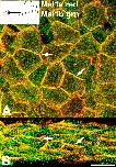 Figure 3. Confocal double-label immunocytochemical localization of Mel1a and Mel1c in Xenopus corneal whole mounts. A: The specimen shown was obtained in the mid-light period (12N). Both Mel1a and Mel1c immunolabeling is observed on the lateral plasma membrane, with some immunoreactivity also occurring in the cytoplasm. The labeling of the plasma membrane displays distinct areas of Mel1a (red), Mel1c (green), and both receptors (yellow). Arrows are provided as reference points to indicate the same points on B. The inset illustrates the 72° rotation on the x-axis of the image in A, indicating the orientation relative to the viewer’s eye in B. B: Three-dimensional reconstructions of confocal z-stacks of optical slices were rotated at 72° degrees on the x-axis to enable optimal viewing of the pattern of immunolabeling. The rotated image shows that the red Mel1a labeling is generally located apically to the green Mel1c labeling. The Mel1a labeling is seen as a relatively broad continuous band of red label on the lateral plasma membrane of the majority of surface CE cells. A somewhat broader band of green Mel1c labeling appears directly basal to the Mel1a label. Some yellow labeling is occasionally observed, indicating some co-localization of Mel1a and Mel1c. There are many areas in the red Mel1a band in which yellow labeling is interspersed between areas of red Mel1a labeling, suggesting that some green Mel1c-labeled receptor is interdigitated among the Mel1a-labeled receptor. The confocal images in both panels are comprised of 13 optical slices of 400 nm each in the z-series. The magnification bar (B) represents 20 µm.