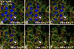 Figure 8. Localization of ZO-1 and Mel1a in progressive confocal optical slices of Xenopus corneal epithelium. A: Image of the most superficial surface of the surface corneal epithelium. In the most apical slice (slice 0.0 µm), red Mel1a, green ZO-1, and merged yellow labeling is observed in variable amounts on different cell membranes. B-F: As the 0.4-µm slices progress deeper into the corneal epithelium layer, the green ZO-1 immunoreactivity gradually lessens, whereas the red Mel1a immunoreactivity increases (note arrowheads indicating an example of this), indicating that the Mel1a receptor is located basal to the zonula adherens, but is in very close proximity in most of the slices (A-C). Nuclei are stained with DAPI. The magnification bar (F) represents 20 µm.
