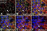 Figure 11. Confocal analysis of Mel1a and Mel1c immunocytochemistry of whole-mounted Xenopus laevis surface corneal epithelium at two separate time points. Three-dimensional reconstructions of confocal z-stacks of optical slices of the 8:00 AM (A, C, and E) and 4:00 PM (B, D, and F) specimens were rotated at 63° on the x-axis to enable optimal viewing of the pattern of immunolabeling. At 8:00 AM (A, C, and E), areas of lateral membranes express only the red Mel1a receptor label (large arrow) or the green Mel1c receptor label (large arrowhead). In some areas of merged Mel1aÂ-Mel1c co-localization, only the yellow color is observed (small arrow), indicating receptor co-localization. There are also areas of membrane that express the yellow co-localization but have small areas of red Mel1a or green Mel1c label interdigitated with the yellow label (asterisks). At 4:00 PM (B, D, and F), the lateral membranes show a more uniform pattern of immunolabeling than observed at the 8:00 AM time point. The yellow co-localization label is predominant in the most apical portion of the membranes, but in the more basal area of the lateral membranes distinct punctate red Mel1a and green Mel1c labeling is also observed. Nuclei are stained with DAPI. The confocal images in panels A and E are comprised of 16 optical slices of 400 nm each in the z-series. The confocal images in panels B and F are comprised of 16 optical slices of 400 nm each in the z-series. The images in panels C and D are comprised of a single optical slice of 400 nm. The magnification bar (F) represents 20 µm.