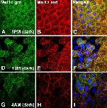 Figure 10. Mel1a and Mel1c immunocytochemistry of whole-mounted Xenopus laevis surface corneal epithelium obtained at 4-h intervals during a 24-h lightâdark cycle. Frogs were housed under a 12 h:12 h lightâdark cycle (6:00 AM: lights on; 6:00 PM: lights off). All tissues in this figure were obtained in the dark. Mel1c labeling is represented in green (A, D, and G) and Mel1a labeling is represented in red (B, E, and H). The yellow labeling in the merged images (C, F, and I) indicates regions of co-localization of the red and green signal. A-C: Corneas obtained at 8:00 PM (2 h after lights off). Mel1c immunolabeling is almost exclusively located in the cytoplasm, but there is intense Mel1a immunoreactivity present in the lateral membranes, and also in the cytoplasm. The cytoplasmic immunolabeling of Mel1a and Mel1c is not co-localized. D-F: Corneas obtained at 12:00 M (mid-dark). Most of the Mel1c immunoreactivity is in the cytoplasm, although some lateral membrane labeling is also detected. Mel1a immunoreactivity is predominant in the lateral membranes, but there are many irregular-appearing cytoplasmic compartments that express Mel1a immunoreactivity, and they do not co-localize with the Mel1c cytoplasmic labeling. Essentially, all Mel1clateral membrane labeling is co-localized with Mel1a membrane labeling. G-I: Corneas obtained at 4:00 AM (2 h before lights on). Most of the Mel1c immunoreactivity is located in the cytoplasm, with very little membrane labeling detected. Most of the Mel1a immunoreactivity is located on the lateral membranes, with some immunoreactivity also appearing in irregular cytoplasmic compartments. The Mel1a and Mel1c cytoplasmic labeling is not co-localized. Nuclei are stained with DAPI. The confocal images in all panels are comprised of three optical slices of 400 nm each in the z-series. The magnification bar (I) represents 20 µm.