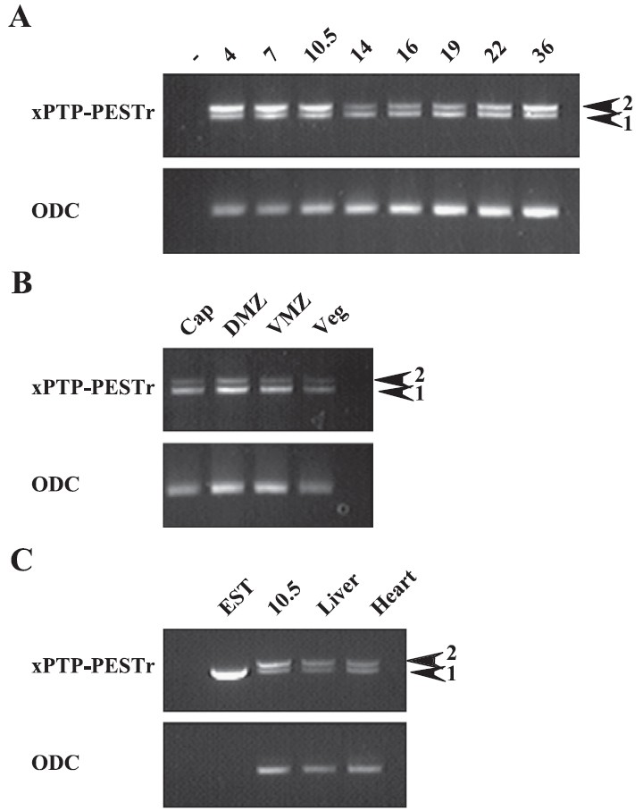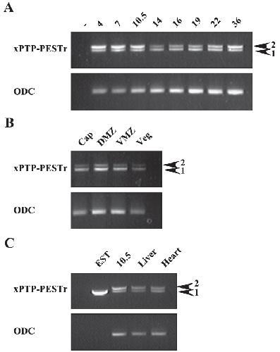heart and liver of an adult male (C) using primer for xPTP-PESTr and ODC.