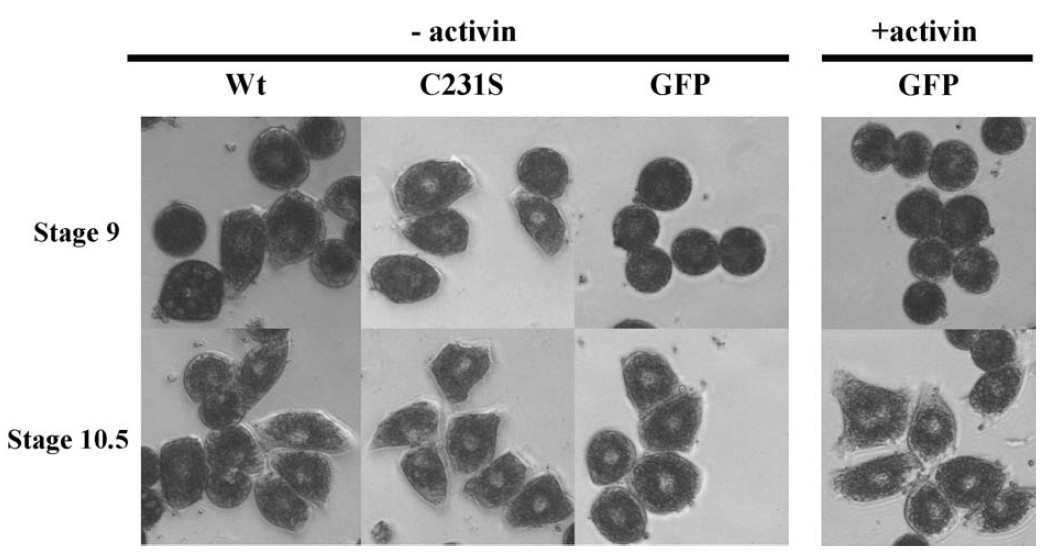 in animal cap expressing either the Wt- or the C231S-PTP-PEST mutant. No extension is observed in the absence of activin ( activin). (C) Optical sections of