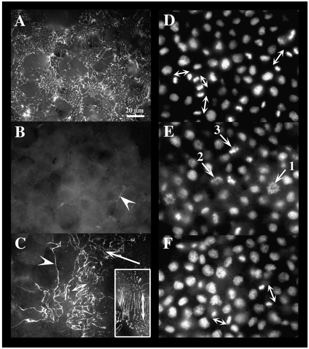 more branching (arrow) and groups of parallel fibrils (double arrow and inset). (D) Nuclei staining of control cells reveals anaphase figures exclusively in the