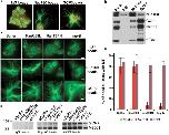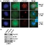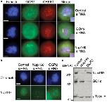 Figure 3. Nup107-160 is critical for MT nucleation at kinetochores in HeLa cells(a) HeLa cells transfected with a control siRNA (top panels), a siRNA against Nup160 (middle panels) or an siRNA directed against GCP2 (bottom panels). The cells were analyzed in a MT re-growth assay at 2 minutes after being returned to 37°C, with staining for α-tubulin (red) and Nup107 (green). Mitotic cells were identified by chromosome morphology through counterstaining with Hoechst 33342 dye (blue). Scale bar= 5 µm(b) Whole cell extracts were made from control HeLa cells (left), or cells depleted of Nup107-160 (center) or of GCP2 (right). The extracts were analyzed by Western blotting with the indicated antibodies to monitor the overall level of depletion through siRNAs. ). Uncropped images of the blots are shown in Supplementary Information, Fig. S3.