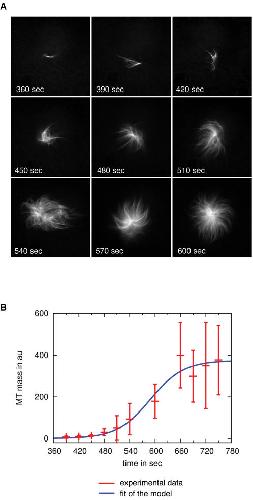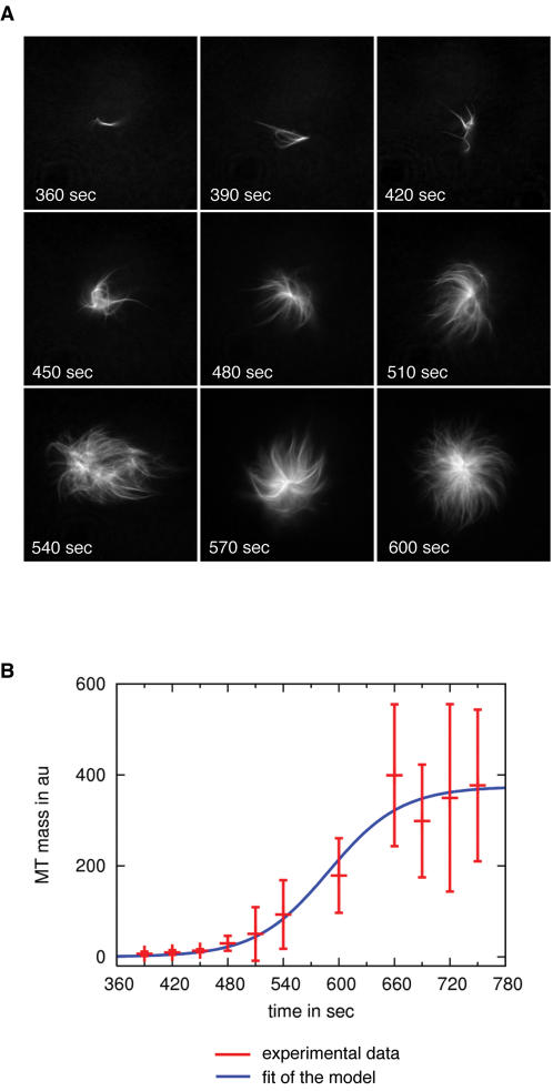 Figure 1. During RanQ69L-mediated aster formation, MTs appear to accumulate exponentially at an initial seed MT. A. Quantification of RanQ69L-mediated MT production in meiotic Xenopus egg extract. RanQ69L was added to Xenopus extract to initiate the formation of spindle-like structures (asters). After fixation, asters were imaged by wide field microscopy at the indicated time points. The first detectable intermediates of aster formation were few individual MT bundles. Rapidly, more MTs were produced around these seed MTs. The diameter of the asters at 480 sec was 10–30 µm. B. Quantification of MT production mediated by RanQ69L. The plot shows fluorescence of the MTs at the prospective aster (with standard deviations) as a function of time. A logistic model can reproduce the initial exponential rise as well as the saturation of MT mass during aster formation. The logistic model with solution was fit to the experimental data of Figure 1 by minimizing A logistic model supports autocatalytic MT production where MT production is limited by resource depletion.