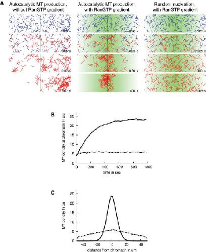 Figure 3. Autocatalytic MT production, dynamic instability, and a RanGTP gradient are necessary and sufficient to target MT production to the center of the gradient. A. MTs in a RanGTP gradient (green indicates high RanGTP concentration). Randomly positioned MTs (blue lines) disappear due to dynamic instability and new MTs are produced (red lines). Without coupling the MT production probability to the RanGTP gradient, MT patches form randomly (left panels). Without autocatalytic MT production, MTs distribute proportional to the RanGTP gradient and do not form patches (right panels). All three components can efficiently concentrate MTs in the center of the gradient (center panels). B. MT density at the centre of the gradient as a function of time with (black line) and without (dashed line) autocatalytic MT production. Without autocatalytic MT production, a constant low MT density is quickly reached, while autocatalytic MT production concentrates MTs in the center of the gradient. C. MT density after 1000 sec as a function of distance from the centre (lines as in B). Autocatalytic MT production efficiently localizes MTs to the center of the gradient.