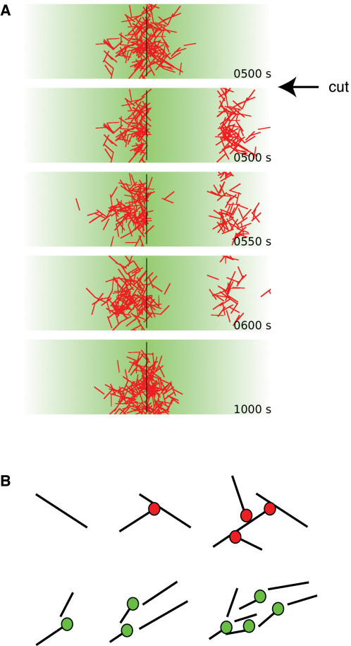 Figure 4. Autocatalytic MT production, dynamic instability, and a RanGTP gradient render MT super-structures robust toward external perturbations. A. The MT super-structure can regenerate within a RanGTP gradient. A fully assembled MT super-structure (top) is divided in two, and one half is moved 20 µm to the right. As MTs disassemble due to dynamic instability, new MTs are produced preferentially in the centre of the gradient. Thereby the severed half disintegrates over time and the integrity of the MT super-structure is re-established. B. Time series of two different mechanisms to achieve autocatalytic MT production. The top series shows a nucleator (red) binding to MTs where it becomes activated and nucleates new MTs. The bottom series shows a MT severing protein (green) binding to MTs and cutting them into fragments. These fragments can grow into new MTs.