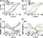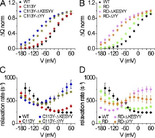Figure 9. ΔYY and ΔKESYY truncations shift ouabain-sensitive transient charge movements to more negative potentials and accelerate charge relaxation at positive potentials. (A and B) Charge–voltage distributions determined from OFF voltage steps (as for closed symbols in Fig. 8 [D and H]) were normalized by their estimated amplitude from fits (Qmax–Qmin, 12.1 nC and 5.4 nC, respectively, for Fig. 8 [D and H]) and were averaged. V0.5 and zq values for each pump type averaged as follows: WT (black), −16 ± 1 mV and 0.93 ± 0.03, n = 3; C113Y (red), −26 ± 1 mV and 0.70 ± 0.01, n = 13; RD (green), −44 ± 1 mV and 0.74 ± 0.02, n = 12; C113Y-ΔKESYY (blue), −96 ± 2 mV and 0.62 ± 0.05, n = 7; C113Y-ΔYY (olive), −75 ± 1 mV and 0.67 ± 0.01, n = 5; RD-ΔKESYY (magenta), −114 ± 2 mV and 0.59 ± 0.02, n = 11; RD-ΔYY (orange), −95 ± 2 mV and 0.60 ± 0.02, n = 5. (C and D) Single exponential fits to the decay time courses of the transient current elicited by the ON voltage steps (e.g., Fig. 8 C, red lines) gave relaxation rates of the slow components of charge movement; their mean values are plotted against voltage in C and D. Error bars represent SEM.