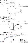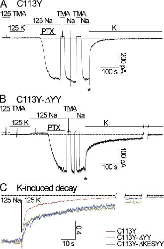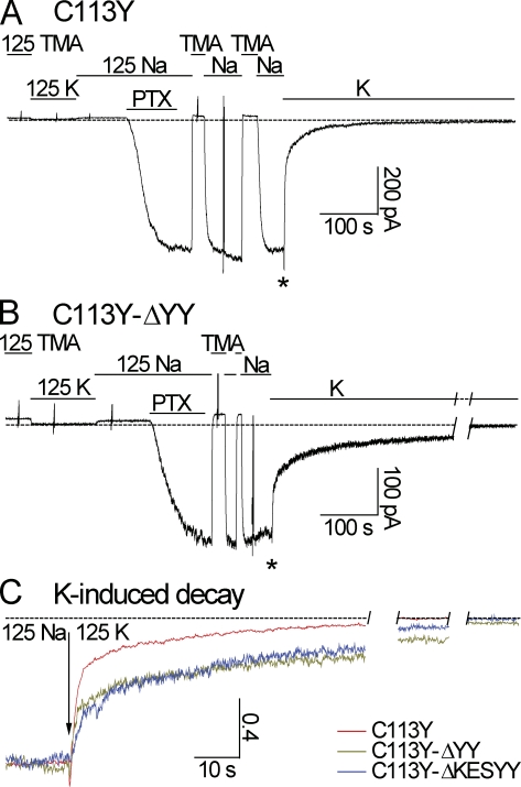 Figure 11. ΔYY and ΔKESYY C-terminal truncations impair Ko-induced closure of palytoxin-bound Na/K pump channels. (A and B) Representative recordings of activation and deactivation of palytoxin-bound Na/K pump channels in outside-out membrane patches (with 125 mM Na but no ATP in the pipette–cytoplasmic side) excised from oocytes expressing C113Y (A) or C113Y-ΔYY truncated (B) pumps; the labeled bars indicate bath (extracellular side) solution changes. A high concentration, 100 nM, of palytoxin (PTX) rapidly opened pump channels in both cases with similar time courses (activation time constant, τact = 21 s for C113Y and 26 s for C113Y-ΔYY). Replacement of all Nao with Ko caused, after a small instantaneous current increase (asterisks), biexponential complete decay of palytoxin-activated current (dotted lines mark current levels in Ko before PTX). (C) Superimposed normalized traces show reduced fractional amplitude of the faster component of Ko-induced decay for the truncated pumps (C113Y-ΔYY, olive; C113Y-ΔKESYY, blue) than for the parent pump (C113Y, red); dotted line as in A and B; breaks in the traces are to show that the decay is complete.