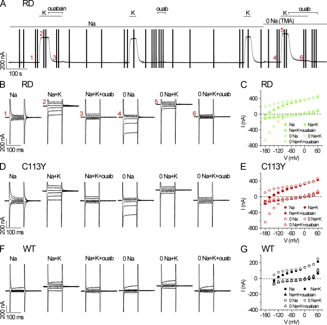 Figure 2. Determination of steady-state Na/K pump current of WT and ouabain-resistant RD and C113Y mutant pumps in the presence and absence of external Na (replaced by TMA). (A) Representative record of current changes at the −50-mV holding potential in a Na-loaded oocyte expressing RD Na/K pumps caused by addition of 15 mM Ko and/or 10 mM ouabain in the presence and then in the absence of Nao as indicated; the vertical lines mark application of 100-ms voltage steps to −180 to 60 mV in 20-mV increments. (B) Selected superimposed current traces from the experiment in A obtained at the times identified on the recording by the red numbers. Analogous traces are superimposed for C113Y (D) and WT (F) pumps. The corresponding steady-state (mean of last 10 ms of each step) current–voltage (I-V) relationships for each Na/K pump type, obtained from the records in B, D, and F, are shown in C, E, and G.