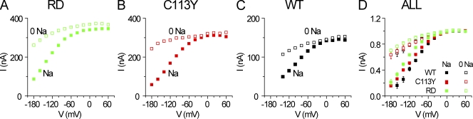 Figure 3. Voltage-dependent inhibition of steady-state outward Na/K pump current by Nao. Inhibition in RD (A), C113Y (B), and WT (C) pumps. Ouabain-sensitive currents in 15 mM Ko, without (open symbols) or with (closed symbols) external Na, were obtained by appropriate subtraction of data shown in Fig. 2 (B–G). (D) To facilitate comparison among the different pumps, each ouabain-sensitive I-V relationship was normalized to its mean amplitude between 0 and 60 mV, and the normalized I-Vs for each pump type, with or without Nao, were then averaged.