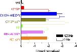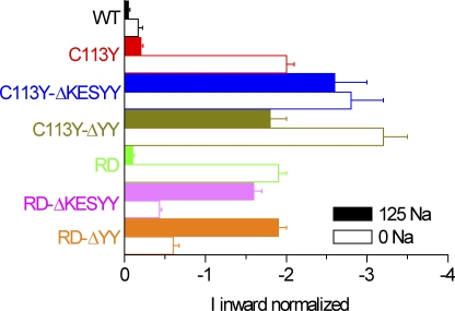 Figure 4. Comparison of the magnitude of ouabain-sensitive inward current in each pump type at −180 mV (−160 mV for WT) in the absence or presence of 125 mM Nao after normalization by the ouabain-sensitive pump current activated by 15 mM [Ko] at the −50-mV holding potential in the same oocyte and [Nao] to allow for differences in expression. Open bars, absence of 125 mM Nao; closed bars, presence of 125 mM Nao. Mean values are −0.04 ± 0.02, n = 4, in 125 mM Nao and −0.17 ± 0.05, n = 4, in 0 mM Nao for WT Na/K pumps (black); −0.20 ± 0.03, n = 8, in 125 mM Nao and −2.0 ± 0.1, n = 8, in 0 mM Nao for C113Y (red); −2.6 ± 0.4, n = 5, in 125 mM Nao and −2.8 ± 0.4, n = 5, in 0 mM Nao for C113Y-ΔKESYY (blue); −1.8 ± 0.2, n = 6, in 125 mM Nao and −3.2 ± 0.6, n = 6, in 0 mM Nao for C113Y-ΔYY (olive); −0.10 ± 0.02, n = 7, in 125 mM Nao and −1.9 ± 0.1, n = 7, in 0 mM Nao for RD (green); −1.6 ± 0.1, n = 8, in 125 mM Nao and −0.43 ± 0.03, n = 8, in 0 mM Nao for RD-ΔKESYY (magenta); and −1.9 ± 0.1, n = 7, in 125 mM Nao and −0.60 ± 0.08, n = 7, in 0 mM Nao for RD-ΔYY (orange). Error bars represent SEM.