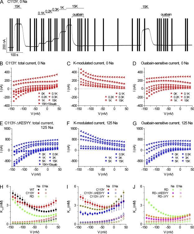 Figure 5. Ko sensitivity of Na/K pump–mediated currents in Nai-loaded oocytes expressing WT or mutant Na/K pumps. (A) Changes in holding current at −50 mV in response to stepwise increments of [Ko] in C113Y Na/K pumps in 0 mM Nao; the vertical lines mark application of 100-ms voltage steps to −140 to 40 mV in 10-mV increments. (B) Steady-state I-V plots at the indicated [Ko] from A. (C and D) Corresponding Ko-modulated I-V plots (C) and ouabain-sensitive I-V plots (D) from data in A and B obtained by appropriate subtraction. (E–G) Analogous I-V plots to those in B–D, but for C113Y-ΔKESYY Na/K pumps in 125 mM Nao. (H–J) Hill fits to the Ko-modulated steady currents at the various [Ko] at each voltage yielded the mean K0.5(Ko) values for each pump type in the absence (open circles) or presence (closed circles) of Nao (WT, black; C113Y, red; RD, green; C113Y-ΔKESYY, blue; C113Y-ΔYY, olive; RD-ΔKESYY, magenta; RD-ΔYY, orange). Error bars represent SEM.