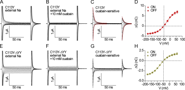 Figure 8. Representative ouabain-sensitive pre–steady-state currents under Na/Na exchange conditions for C113Y and C113Y-ΔYY pumps. (A–D) C113Y pumps; (E–H) C113Y-ΔYY pumps. Superimposed current records obtained in 125 mM Nao before (A, C113Y; E, C113Y-ΔYY) and after (B, C113Y; F, C113Y-ΔYY) adding 10 mM ouabain. Ouabain-sensitive transient currents determined by direct subtraction of the records in A and B and in E and F, respectively, are shown in C for C113Y and in G for C113Y-ΔYY Na/K pumps (red lines in C show single exponential fits to ON and OFF transient currents elicited by steps to 60 mV and −180 mV for relaxation rate estimates of Fig. 9 [C and D]). Pre–steady-state charge was obtained directly as the time integral of the transient currents (C and G) at the ON and OFF voltage steps after baseline subtraction of any steady current. (D and H) The charge–voltage distributions were fit with the Boltzmann relationQ(V)=Qmax+(Qmin−Qmax)1+e[zqF(V−V0.5)/RT],where V is the test voltage, Qmin and Qmax are the charge moved for extreme negative and positive voltage steps, zq is the effective charge, V0.5 is the midpoint voltage, and F, R, and T have their usual meaning. ON and OFF values are, respectively, for D as follows: Qmin, −4.0 nC and −3.9 nC; Qmax, 7.5 nC and 8.2 nC; zq, 0.74 and 0.71; V0.5, −29 mV and −25 mV. ON and OFF values are, respectively, for H as follows: Qmin, −3.8 nC and −3.7 nC; Qmax, 1.9 nC and 1.7 nC; zq, 0.66 and 0.69; V0.5, −74 mV and −77 mV.