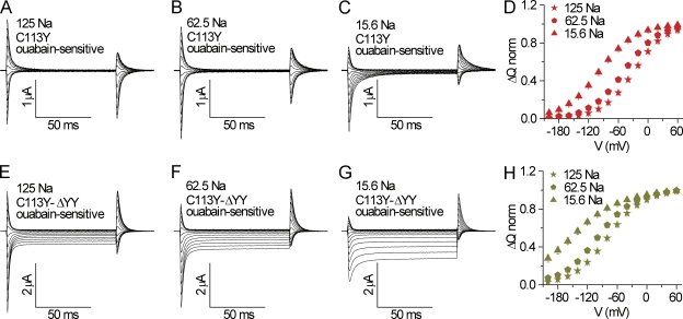 Figure 10. Similar Nao dependence and voltage dependence of transient charge movements in parent C113Y pumps and in C113Y pumps with C-terminal truncations. (A–C) Superimposed ouabain-sensitive current records (obtained by subtraction as in Fig. 8 [C and G]) determined in the same oocyte for C113Y pumps exposed to 125 mM (A), 62.5 mM (B), and 15.6 mM (C) [Nao]; Na was replaced by equimolar TMA. (E–G) Similar ouabain-sensitive transient currents in an oocyte expressing C113Y-ΔYY pumps exposed to 125 mM (E), 62.5 mM (F), and 15.6 mM (G) [Nao]; note that the steady inward currents at negative test voltages became larger as [Nao] was lowered (E–G). (D and H) Pre–steady-state charge determined as integrals of OFF transients was plotted against test voltage and fitted with Boltzmann relations and then normalized and averaged for four C113Y oocytes (D) and three C113Y-ΔYY oocytes (H). ΔV0.5 for the twofold and eightfold reductions of [Nao], respectively, averaged as follows: C113Y (red), −22 ± 1 mV and −80 ± 3 mV, n = 4; C113Y-ΔYY (olive), −25 ± 2 mV and −90 ± 10 mV, n = 3; C113Y-ΔKESYY, −33 mV and −102 mV, n = 1. Fractional electrical distance, λ, estimated from these data via ΔV0.5 = (RT/λF)ln([Nao]1/[Nao]2) is ∼0.7 (0.73 for C113Y and 0.65 for C113Y-ΔKESYY), as for WT.