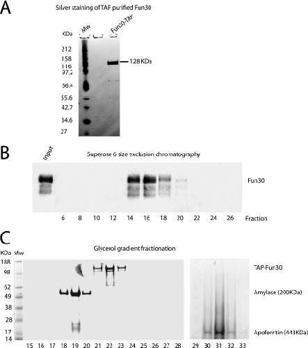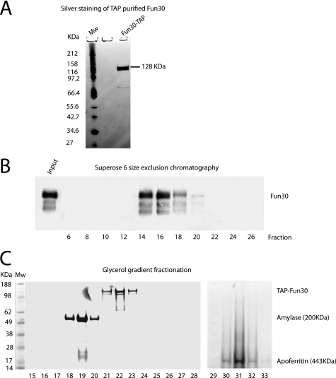 FIGURE 1. Purification of the Fun30 complex. A, SDS-PAGE and silver staining of TAP-purified Fun30. B, Superose-6 chromatography of TAP-purified Fun30. Fractions containing Fun30 were detected by Western blotting with anti-TAP antibody. The Fun30 peak (fraction 16) corresponds to a molecular mass of 250 kDa calculated from a standard curve of molecular mass standards run on the same column (not shown). C, Fun30 was resolved by 10–40% glycerol gradient sedimentation together with amylase and apoferritin as molecular weight markers. Coomassie Blue staining followed SDS-PAGE of the fractions indicated where each protein elutes. The elution profile for Fun30 peaked in fraction 22, which was consistent with a complex of about 250 kDa.