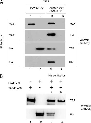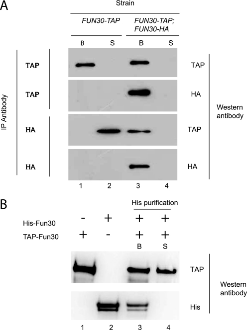 FIGURE 2. TAP-purified Fun30 is a homodimer. A, Western blots of Fun30 recovered following reciprocal coimmunoprecipitation from a yeast strain expressing either TAP-tagged Fun30 (lanes 1 and 2) or both HA- and TAP-tagged Fun30 (lanes 3 and 4). Detection of HA-tagged protein in the bound fraction (B) following TAP IP and TAP following HA IP (lane 3) indicates that the two forms of Fun30 interact. Immunopurification effectively removed Fun30 from the supernatant (S). B, preparations of Fun30 purified by TAP tag and His tag were mixed together and subject to IP with nickel-agarose beads. The presence of TAP-tagged Fun30 on the nickel beads indicates that these two proteins can interact.