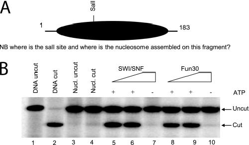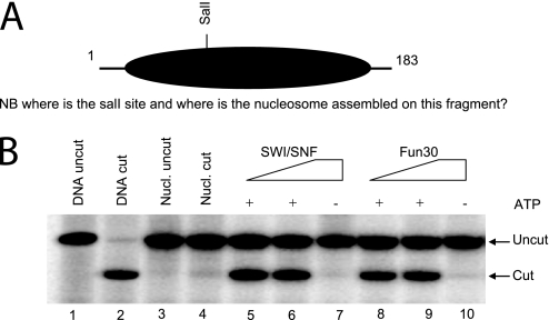FIGURE 5. Fun30 is an ATP-dependent chromatin remodeling enzyme. A, schematic illustration of the template used for restriction enzyme accessibility assays. B, restriction enzyme accessibility assay. Increasing amounts of SWI/SNF (∼2–8 nm, lanes 5–7) and Fun30 (∼10–40 nm, lanes 8–10) based on normalization were added to ∼10 ng of the GUB template in the presence or absence of 2 mm ATP as indicated. The binding reactions were then treated with 10 units of SalI for 30 min at 30 °C and the proportion of DNA cleaved was assessed by electrophoresis.
