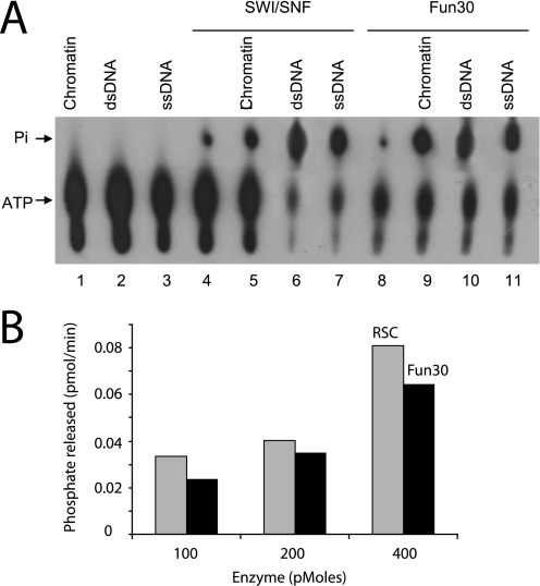 FIGURE 3. Fun30 has ATPase activity. A, TLC analysis showing ATPase activity of the Fun30 complex. The ATPase activity of ∼12 nm Fun30 (lanes 8–11) is compared with that of the ∼5 nm SWI/SNF complex (lanes 4–7) using 2 ng of either single-stranded (ss) or double-stranded (ds) DNA, or 2 ng of HeLa chromatin as the substrate. In lanes 1–3, no chromatin remodeling proteins are added, and in lanes 4 and 8, no substrate is included. B, Fun30 has a specific activity comparable with RSC. Rates of ATP hydrolysis were assessed using a real time ATPase assay using the indicated quantities of enzyme in the presence of 2 ng of chromatin.