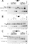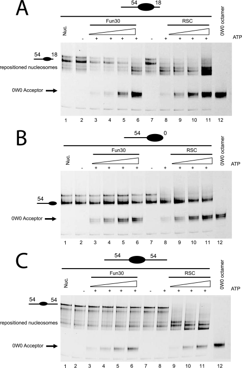 FIGURE 6. Fun30 has higher activity in histone dimer exchange than nucleosome repositioning. 10-μl reactions containing 0.25 pmol of nucleosomes (250 nm) in which H2B is fluorescently labeled with Cy5 assembled at the murine mammary tumor virus nucleosome A (NucA) positioning sequence flanked by the indicated lengths of linker DNA were incubated with Fun30 (100, 200, 300, and 400 pm, lanes 3–6) or RSC (100, 200, 300, and 400 pm, lanes 8–11) in the presence of 0.75 pmol of histone tetramers assembled onto 147-bp DNA (0W0). In each panel, lane 1 contains nucleosomes assembled on the appropriate donor DNA fragment and lane 12 contains the 0W0 fragment assembled with an octamer including fluorescently labeled H2B. Following native gel electrophoresis, the fate of H2B was monitored by fluorescent scanning of the gels. In some cases the signal moves to a location consistent with repositioning of nucleosomes on the donor DNA fragment. In others, transfer to the 0W0 acceptor DNA, which has a distinct mobility, could be detected. Fun30 was observed to cause dimer exchange even in circumstances where repositioning was inefficient. A, the donor nucleosome has an asymmetric linker DNA of 54 bp on one end and 18 bp on the other (54A18). B, the donor nucleosome has a 54-bp linker DNA on one end and 0 bp on the other (54A0). C, the donor nucleosome has 54-bp linkers on either side (54A54).