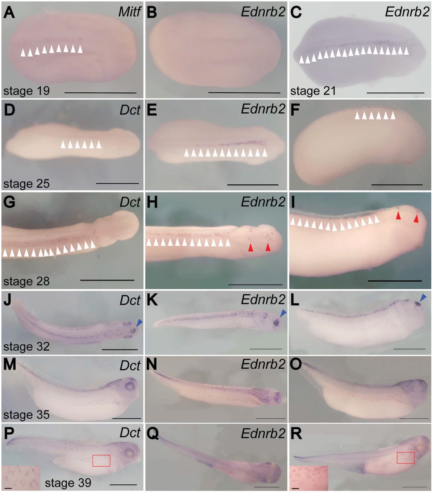 Fig. 1. Ednrb2 and melanoblast marker gene expression patterns in Xenopus embryos by WISH. A,B: Mitf expression is detected (A), but there is no Ednrb2 expression in a stage-19 embryo. C: Ednrb2 expression (arrowheads) is first detected in the NT at stage 21. DâF: Weak Dct (D) and strong Ednrb2 (E,F) expression is detected at stage 25. GâI: Dct (G) and Ednrb2 (H,I) expression is detected in the NT and only Ednrb2 is expressed in the head region at stage 28 (red arrowheads). JâR: The expression pattern of Ednrb2 (K,O,R) resembles that of Dct (J,M,P) except in the RPE (Dct only). Blue arrowheads indicate expression in the epiphysis. Note that after stage 35, melanophores are pigmented, but because the embryos are bleached in these embryos, the melanins are not visible. Insets are magnified images in the squares (scale bar ¼ 100 mm) and show dendritic pigmented melanophores expressing both Dct (P) and Ednrb2 (R). F, I, L, O, and R are lateral views of E, H, K, N, and Q, respectively. Heads are on the right side of each picture. Scale bar ¼ 1 mm.