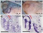 Fig. 3. Ectopic induction of Ednrb2 expression due to Mitf over-expression. A,B: Embryos in which Mitf-GR was injected, stained by Ednrb2 WISH (violet). Mitf-GR activity was induced with DEX treatment at stage 25 (A), or not induced (B). DEX-treated embryo showing ectopic Ednrb2 expression in cranial NCCs (A). This expression is not observed in B. The blue stain indicates lacZ staining as a tracer. C,D: Serial sections in the eye region of a Mitf-GR injected embryo.