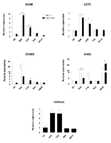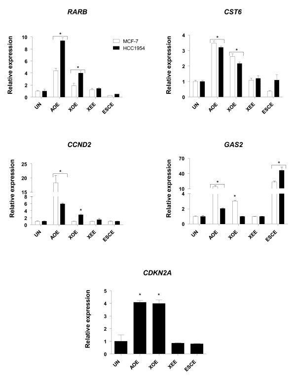 Figure 1. Expression of tumour suppressor genes after reprogramming in oocyte, egg and embryonic stem cell extracts Expression of RARB, CST6, CCND2, GAS2 and CDKN2A after 6 hours reprogramming analysed by Q-PCR. Data are shown as fold increase compared to the calibrator sample (UN: untreated cells). Relative quantification to the expression of ACTIN (ACTB) was performed for each gene. Study of CDKN2A expression of was only performed in HCC1954 since this gene is deleted in MCF-7 cells.* indicates P < 0.05 for treated groups different from UN.