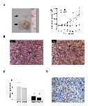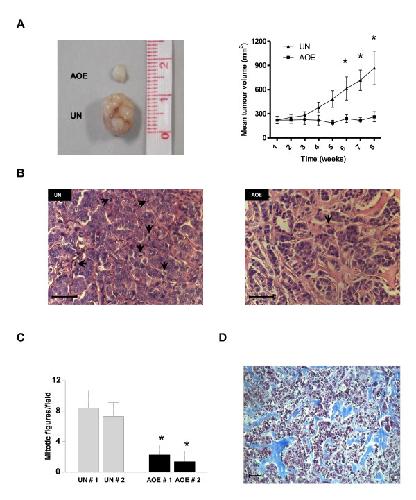 Figure 6. Effect of epigenetic reprogramming on in vivo tumorigenicity. Macroscopic and microscopic analyses of tumour xenografts. (A) Macroscopic appearance of untreated (UN) and AOE-treated tumour xenografts (AOE) and relative tumour growth curves (* indicates P < 0.05). (B) Eosin-Haematoxylin staining of untreated tumour sections (black arrows: mitotic figures; Bar = 50 μm). (C) Number of mitotic figures for two independent tumours in untreated (UN) and AOE-treated xenografts (AOE) (* indicates P < 0.05). (D) Interstitial stroma present in AOE-treated tumours stained for collagen (blue staining; Bar = 50 μm).