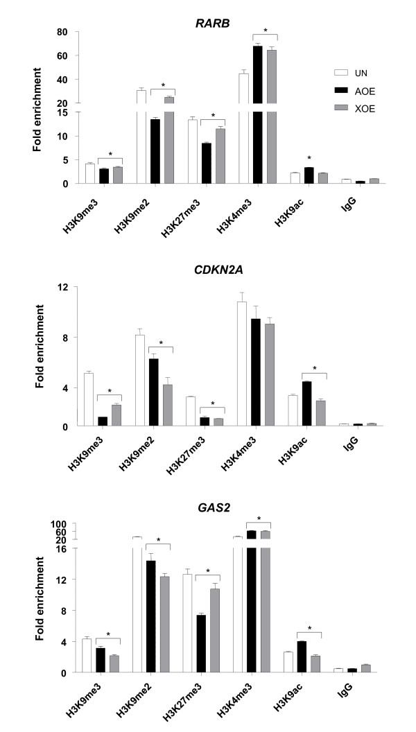 Figure 3. Reprogramming of histone marks by oocyte extracts. Analysis of RARB, CDKN2A and GAS2 gene promoters by ChIP. Data are presented as fold enrichment to input chromatin and indicate reprogramming of histone repressive (H3K9me3, H3K9me2, H3K27me3) and active (H3K4me3, H3K9Ac) marks by different extracts after 6 hours of treatment. * indicates P < 0.05 for treated groups different from UN.