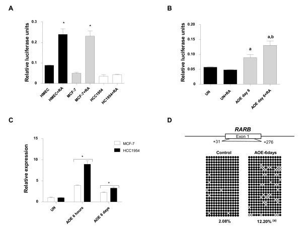 Figure 4. Epigenetic reprogramming stability of tumour suppressor genes in AOE. Reprogramming of the tumour suppressor gene RARB persists 6 days after treatment of MCF-7 and HC1954 cells with AOE. (A) Promoter activity in HMEC, MCF-7 and HCC1954 cells with or without RA treatment measured by luciferase assay (* indicates P < 0.05 for RA treated cells different from the untreated group). (B) RARB promoter in retinoic acid resistant HCC1954 cells can respond to RA after reprogramming (P < 0.05; a = AOE and AOE+RA vs UN; b = AOE + RA vs AOE). (C) RARB expression by Q-PCR. * indicates P < 0.05 of treated cells compared to UN. (D) DNA demethylation is maintained in HCC1954 cells after 6 days of treatment as shown by bisulfite sequencing (similar results were obtained with MCF-7 cells).