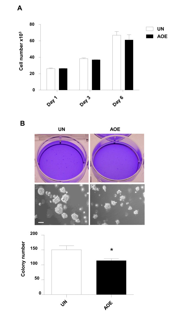 Figure 5. Effect of epigenetic reprogramming on malignant cell phenotype. Cancer cell growth after reprogramming with AOE. (A) Proliferation of MCF-7 cells after 1, 3 and 6 days of culture in adherent conditions as measured by MTT assay. (B) Growth of MCF-7 cells in anchorage-independent conditions. The top panels show cultures stained with crystal violet and representative fields of view of the same cultures in soft agar. The bottom panel show quantification of colony number as counted under a stereomicrosope. Bar = 100 μm. * indicates P < 0.05.