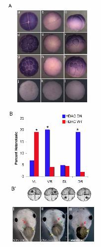 Figure 1. Early HDAC mRNA injection induces heterotaxia. (A) Xenopus HDAC mRNA expression pattern is shown by in situ hybridization with early Xenopus embryos. HDAC mRNA presents a symmetric expression pattern by animal cells at the stage 3 (4 cells) (a,b,c), at the stage 5 (16 cells) (d,e,f) and at the stage 7 (64 cells) (g,h,i). in situ reaction control with no secondary (j, animal view) or no probe added to the reaction (k, animal view; l, vegetal view). (B) Embryos injected with HDAC DN on the ventral or dorsal right blastomeres presented significant levels of heterotaxia (VR 20% heterotaxia p < 0.01, n = 55; DR 19% heteroatxia p < 0.01, n = 42; VL 7% heterotaxia p = 0.3 n = 55; DL 2% heterotaxia p = 0.7). Embryos injected with HDAC WT on the ventral left side presented significant levels of heteroatxia (VL 19% heterotaxia p < 0.01, n = 68; VR 4% heterotaxia p = 0.8, n = 49; DL 4% heteroataxia p = 0.8, n = 44; DR 2% heterotaxia p = 0.5, n = 50). (B`) Schematic showing the injected blastomere at the 4 cell stage. (I) Wild type phenotype showing the gut coil to left (yellow arrow), the gall bladder on the right (green arrow) and the heart loop on right (red line). (II) Situs inversus phenotype where all three organs analyzed are found inverted. (III) Heterotaxic phenotype showing the heart loop to the left (red arrow).