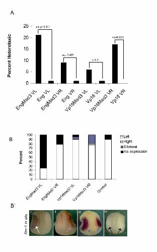 Figure 5. Mad3 is a new left-right determinant. (A) Single ventral left or ventral right blastomeres were injected with EngMad3 or Vp16Mad3 constructs and organ placement was scored at stage 45. Significant levels of heterotaxia were observed when embryos were injected with EngMad3 (left: 21%, n = 96, p < 0.001; right: 12%, n = 91, p = 0.005; control: Eng) or with Vp16Mad3 on the right side (17% n = 90, p < 0.001; 6% n = 127, p = 0.1, control: Vp16). (B) Embryos injected with EngMad3 or Vp16Mad3 were processed for in situ hybridization at stage 21 with a XNr-1 probe. XNr-1 misexpression was correlated with Vp16Mad3 injection (right injected embryos: 19% bilateral expression, n = 117; left injected: 5% bilateral expression, n = 105) and EngMad3 (left injected: 75% no expression, n = 74; right injected: 21% no expression, n = 93) if compared to control embryos (uninjected, 10% no expression, n = 103). (B') XNr-1 expression pattern characterized in EngMad3 or Vp16Mad3 injected embryos. I- Left expression indicated by the white arrow; II-right expression indicated by the gray arrow; III- Bilateral XNr-1 expression indicated by the two blue arrows; IV- Absence of XNr-1 expression as indicated by the two black arrows.