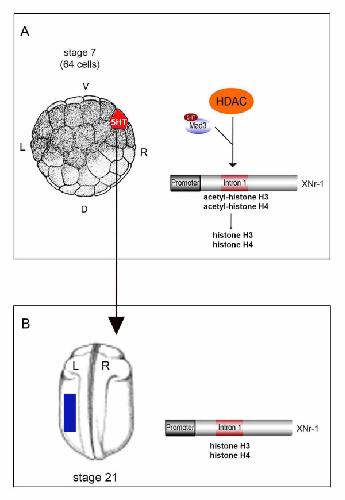 Figure 7. HDAC activity is required during LR development. (A) In this study, we found that early HDAC activity between stages 1-7 is important to proper set the pattern of expression of XNr-1 at stage 21. In addition, we also show that HDAC activity and Mad3 are important on the right side of the embryo to set XNr-1's expression and that Mad's biological activity is dependent on 5HT. Despite HDAC and Mad3 mRNAs present a symmetric pattern of expression, one theory is that because 5HT is asymmetrically distributed in the right blastomeres at stage 7 (red), 5HT binding on Mad3 (blue) may recruit HDAC activity (orange) to the intronic region of XNr-1 on the right of the embryo. HDAC activity, at early developmental stages, may be important to decrease the levels of acetylation of histone H3 and H4 on the intronic region of Nr1. (B) At stage 21, low levels of acetylation on histones (H3 and H4), set by early HDAC activity, would contribute to repress the expression of Nr1, that will be expressed only on the left side of the embryo (blue box). V-ventral; D-dorsal; R-right; L-left.