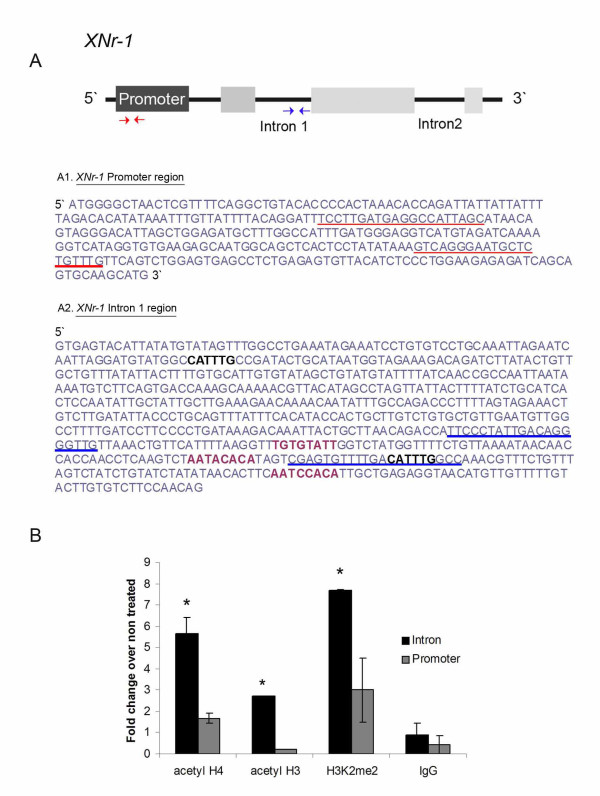 Figure 3. HDAC inhibition leads to increased levels of acetylated histones and H3K4me2 on the XNr-1 gene. (A) Schematic showing the structure of the Xenopus Nr-1 gene. Light gray boxes represent the protein-coding and the dark gray box represents the promoter region (adapted from [53]). Intronic regions 1 and 2 are indicated. Red and blue arrows represent the primer set used for qPCR reaction for the promoter and intronic region, respectively. (A1) The red lines indicate the sequence of the XNr-1 promoter region used to design the primer set for qPCR reaction. (A2) The regions underlined show the sequence used for primer set design. In purple are highlighted the FAST binding domains as in [53] and the black CATTTG indicates two putative Mad binding sites. (B) Chromatin isolated from embryos exposed to NaB from stage 1-7 and allowed to develop until stage 21 in 0.1X MMR was used for ChIP with anti-acetyl H4, anti-acetyl H3, anti-H3K4me2 and rabbit IgG (Control) followed by qPCR analysis against the promoter region (gray bar) and intronic region (black bar) of XNr-1. The levels of acetylated H4 and H3 and H3K4me2 were increased only on the intronic region (black bars).