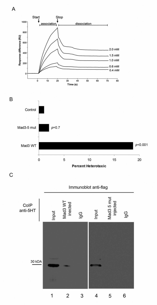 Figure 6. Mad3's biological activity depends on 5HT. (A) Sensorgram of serotonin binding to GST-Mad3. Data represent the difference between the sample cell (GST-Mad3) and the reference cell (GST). A blank run (buffer only) has been subtracted from all curves. Four different analyte (5HT) concentrations (2, 1.5, 1, 0.8 and 0.4 mM were injected). Injection start and stop are indicated by arrows. The data shown are representative of 3 independent experiments. (B) Embryos were injected at stage 1 with Mad3 WT or Mad3-5mut and scored for left-right phenotype at stage 45. Embryos injected with Mad3 WT presented significant levels of heterotaxia (17%, n = 52, p = 0.001) whereas Mad3-5mut injected embryos presented only 2% of heterotaxia (n = 104, p = 0.7) when compared to control group. (C) Co-Immunoprecipitation assay. Xenopus embryos at the 1 cell stage were injected with Mad3 WT-flag (lanes 1,2,3) or Mad3-5mut-flag (lanes 4,5,6) and collected at the stage 7 (64 cells). The whole protein lysates were incubated with anti-5HT antibody followed by protein-A agarose. Lane 1: 10% Input; Lane 2: whole lysate from Mad3 WT-flag injected embryos plus anti-5HT; Lane 3: negative control (whole lysate from Mad3 WT injected embryos plus rabbit IgG); Lane 4: 10% input; Lane 5: whole lysate from Mad3-5mut-flag injected embryos plus anti-5HTLane 6: negative control (whole lysate from Mad3-5mut-flag plus rabbit IgG).