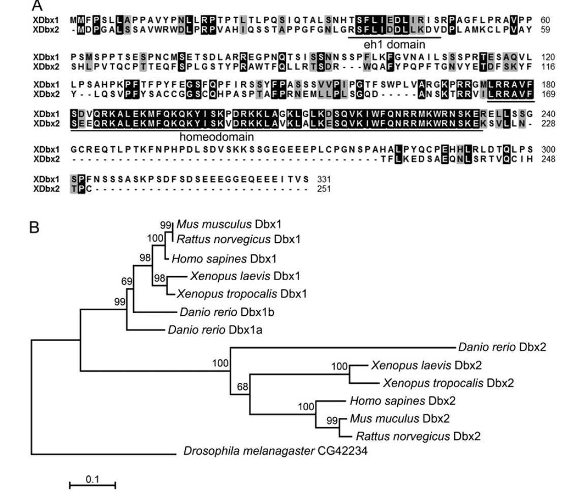 Fig. 1. Alignment and phylogenetic analysis of X. laevis Dbx proteins. (A) Alignment of the XDbx1 and XDbx2 protein sequences. Identical amino acids are high-lighted by