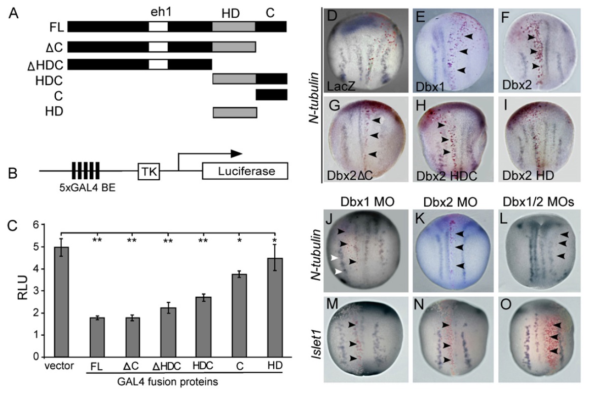 relative light units. âp < 0.05; ââp < 0.001. (DâI) In situ hybridization with N-tubulin in embryos injected on one side with control LacZ mRNA and the indicated XDbx