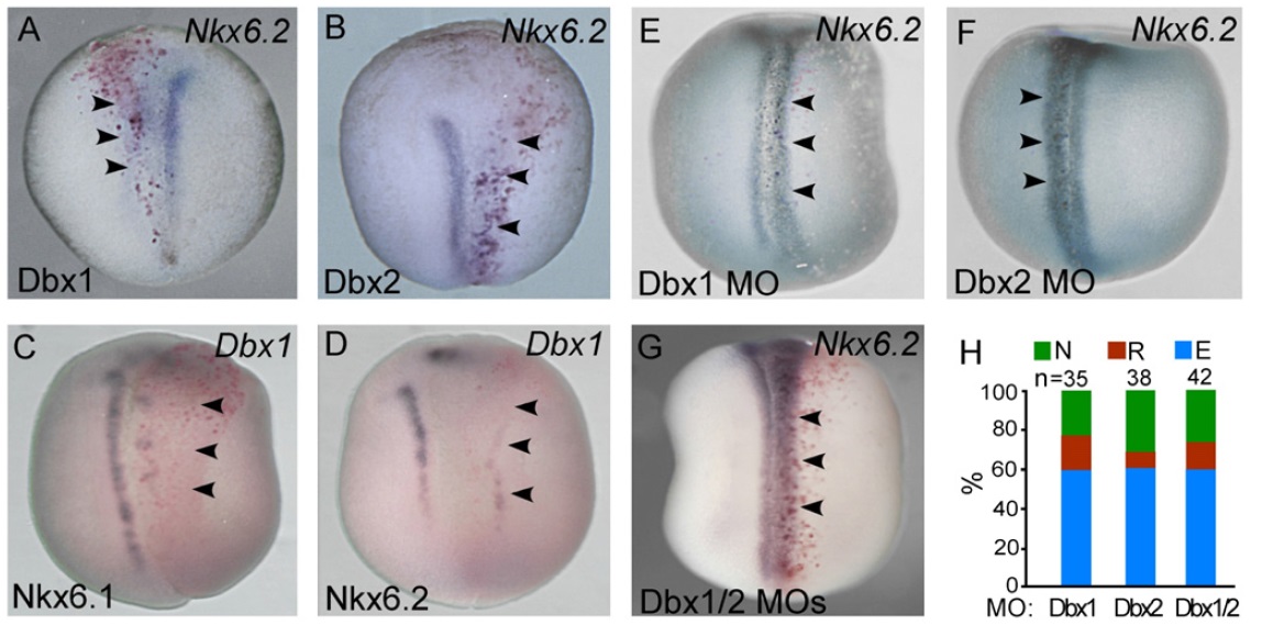 (F) or XDbx1/2 MOs (G). (H) Statistics of the embryos shown in EâG. The percentage of embryos with normal (N), reduced (R) and expanded (E) Nkx6.2 expression are