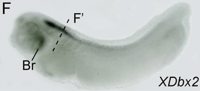 XDbx1 and XDbx2 revealed by in situ hybridization. (BâE) Stage 15, dorsal view, anterior to the left. The red broken lines indicate the expression boundary of XDbx2. (FâG)