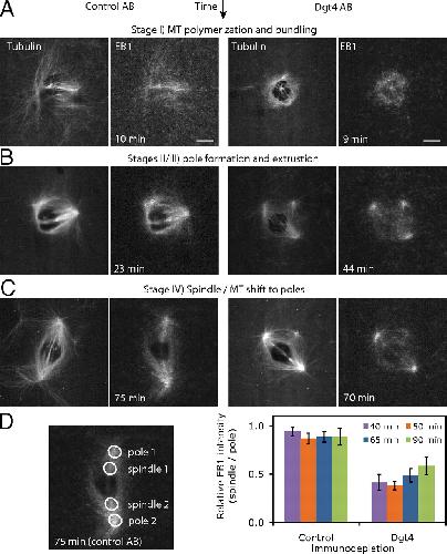 Fig. 4. Visualization of growing MT plus ends via GFP-EB1 in extracts with control antibody (Left) or anti-Dgt4 antibody (Right). (A) Representative images of tubulin (Cy3-channel) and GFPâEB1 (140 nM) are shown for extract incubated with control or Dgt4 antibody (see Fig. 3G and Fig. S3 CâE) at three assembly stages (see Fig. 1D). (B and C) Augmin-inhibited spindles show a reduction of EB1âGFP comets from the middle of the spindles. Note the prominent density of EB1âGFP comets at the acentrosomal poles in C (both control and Dgt4 AB). (Scale bars, 10 μm.) See also Movie S3 (control AB) and Movie S4 (Dgt4 AB). (D) Quantitation of the ratio between the EB1 intensity in the midzone and near the poles (see circles for zone of measurement). Mean and SEM are derived from three independent experiments (2â7 spindles measured for each time point in each independent experiment).