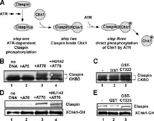 Figure 3. Xmus101 functions after assembly of the Claspin–Chk1 complex during AT70-mediated Chk1 activation. (A) A depiction of the Chk1 activation pathway. (B) Extracts were supplemented with recombinant GST-Claspin CKBD and the following additional components: buffer (lane 1), the A70 oligonucleotide (lane 2), preannealed AT70 oligonucleotides (lane 3), or preannealed AT70 oligonucleotides plus HU142 (final concentration: 50 ng/μl; lane 4). GST-Claspin CKBD phosphorylation was assessed after a 100-min incubation, according to published procedures (Kumagai and Dunphy, 2003). (C) GST-Claspin CKBD shift assay in extracts containing AT70 and buffer (lane 1), GST (15 μM; lane 2), or GST-CT333 (806 nM; lane 3). (D) Extracts were supplemented with bead bound recombinant Xchk1-GH (Kumagai and Dunphy, 2000) and the following additional components: buffer (lane 1), the A70 oligonucleotide (lane 2), preannealed AT70 oligonucleotides (lane 3), or preannealed AT70 oligonucleotides plus HU142 (final concentration: 50 ng/μl; lane 4). After a 100-min incubation, the beads were isolated and washed, and bound proteins were eluted with 2× SDS-PAGE sample buffer. The presence of Claspin and Xchk1-GH in the eluate was then determined by immunoblotting with antibodies against Claspin and GST, respectively (Jeong et al., 2003). (E) Claspin-Chk1 binding assay in extracts containing AT70 and buffer (lane 1), GST (15 μM; lane 2), or GST-CT333 (806 nM; lane 3).