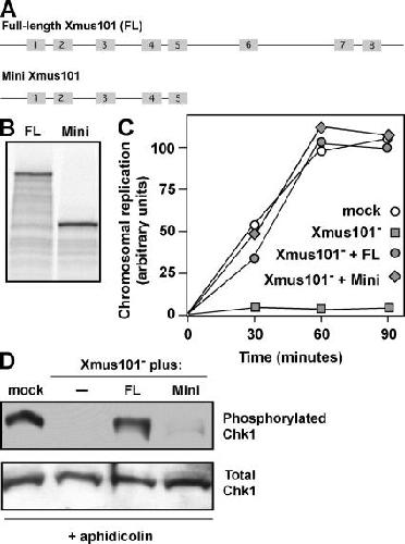 Figure 4. A separation-of-function mutant of Xmus101. (A) Schematic representations of full-length Xmus101 and Mini. (B) Constructs encoding either full-length Xmus101 (FL) or Mini were transcribed and translated in vitro in rabbit reticulocyte lysates in the presence of [35S]methionine. The radio-labeled proteins were then run out on SDS-PAGE and visualized after autoradiography. (C) Xmus101 was depleted from egg extract. Depleted extract was then supplemented (0.1 vol) with either unprogrammed reticulocyte lysates (Xmus101−) or lysates expressing either FL or Mini Xmus101. A mock-depleted sample was also prepared. The reconstituted extracts were then combined with sperm chromatin and α-[32P]dATP, and DNA replication was measured according to standard procedures (Walter and Newport, 1999). Samples were taken at 30, 60, and 90 min for analysis. (D) The reconstituted extracts described in C were supplemented with sperm chromatin and the DNA replication inhibitor aphidicolin (100 μg/ml). After a 60-min incubation, the samples were probed by immunoblotting for both activated and total Chk1.
