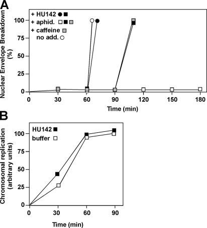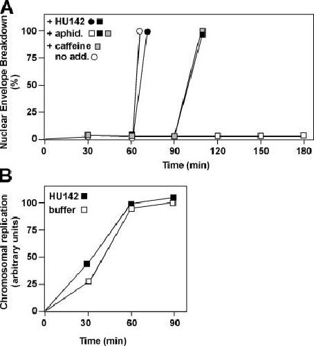 Figure 5. HU142 allows mitosis in aphidicolin-treated cycling extracts. (A) Cycling extracts were prepared and supplemented with sperm chromatin (1,000/μl). Extracts were further supplemented, where indicated, with aphidicolin, HU142, or 5 mM of caffeine. Entry into mitosis was determined by nuclear envelope breakdown. (B) Egg extracts were prepared and supplemented with sperm chromatin and HU142, as indicated. DNA replication was then assessed as in Fig. 4 C.