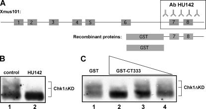 Figure 2. Two inhibitors of the Xmus101 Chk1 activation function. (A) A cartoon of Xmus101 showing the region of the protein that was used as antigen to produce the HU142 antibody as well as recombinant proteins used in this study. The numbered boxes refer to BRCT domains (Garcia et al., 2005). (B) Extracts were supplemented with either nonspecific IgG (lane 1) or HU142 (lane 2; final concentration: 50 ng/μl). Both samples were then further supplemented with recombinant Chk1ΔKD and AT70. After a 100-min incubation, samples were taken and probed for Chk1ΔKD as in Fig. 1 A. (C) Either GST (15 μM; lane 1) or GST-CT333 (806 nM, lane 2; 322 nM, lane 3; 161 nM, lane 4) was added to egg extract along with AT70 and Chk1ΔKD. After a 100-min incubation, samples were taken and probed for Chk1ΔKD as in Fig. 1 A.