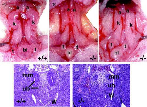 Kidney phenotypes in Sall1-deficient mice. (A) Kidneys (k) of wild-type newborn. Urinary bladder (bl) is filled with urine. (B). Kidneys of Sall1-deficient newborn. Note that kidneys are absent and the urinary bladder is not inflated with urine. Other organs, such as adrenal glands (a) and testis (t), are normal. (C) Kidneys of another Sall1-deficient newborn with severe bilateral kidney hypoplasia. Urine is absent in the bladder. (D) Metanephros in wild-type mice at 11.5 dpc. Ureteric bud (ub) branches from Wolffian duct (W) and metanephric mesenchyme (mm) are condensed around the bulging ureteric bud. (E) Metanephros in Sall1-deficient mice at 11.5 dpc. Metanephric mesenchyme is formed but reduced in size and is not invaded by the ureteric bud. Scale bar: 100 mm.